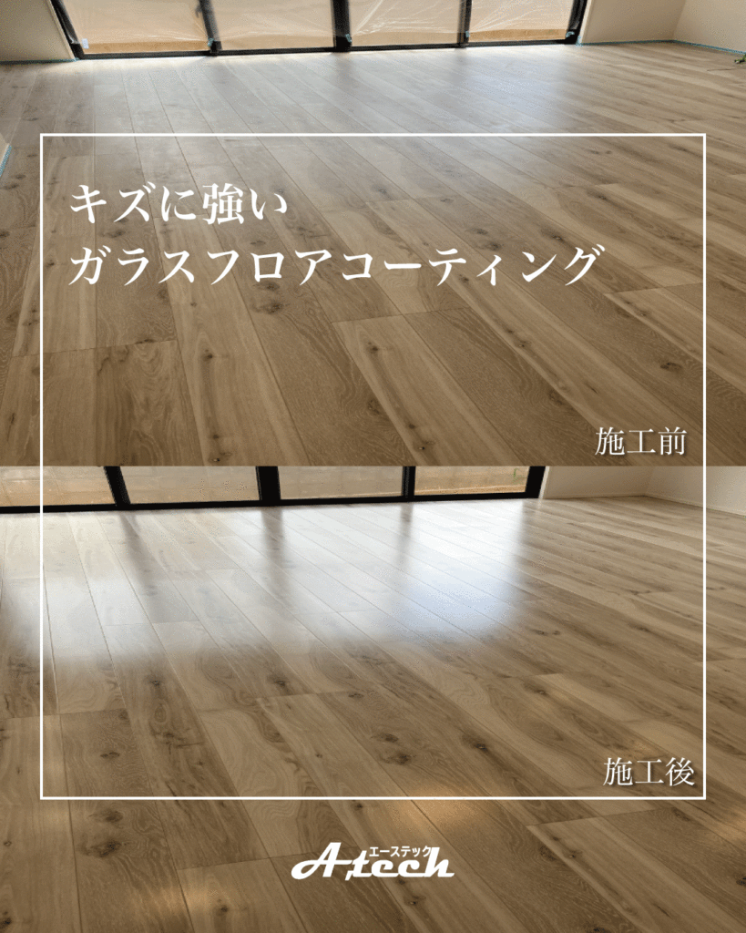 ガラスコーティングは硬度が高く、日常生活でつきやすいキズから床をしっかり守ります。さらに、万が一キズがついても目立ちにくいのが特長です。仕上がりは落ち着いたマットな質感で、フローリング本来の風合いを活かした自然な仕上がりになります。