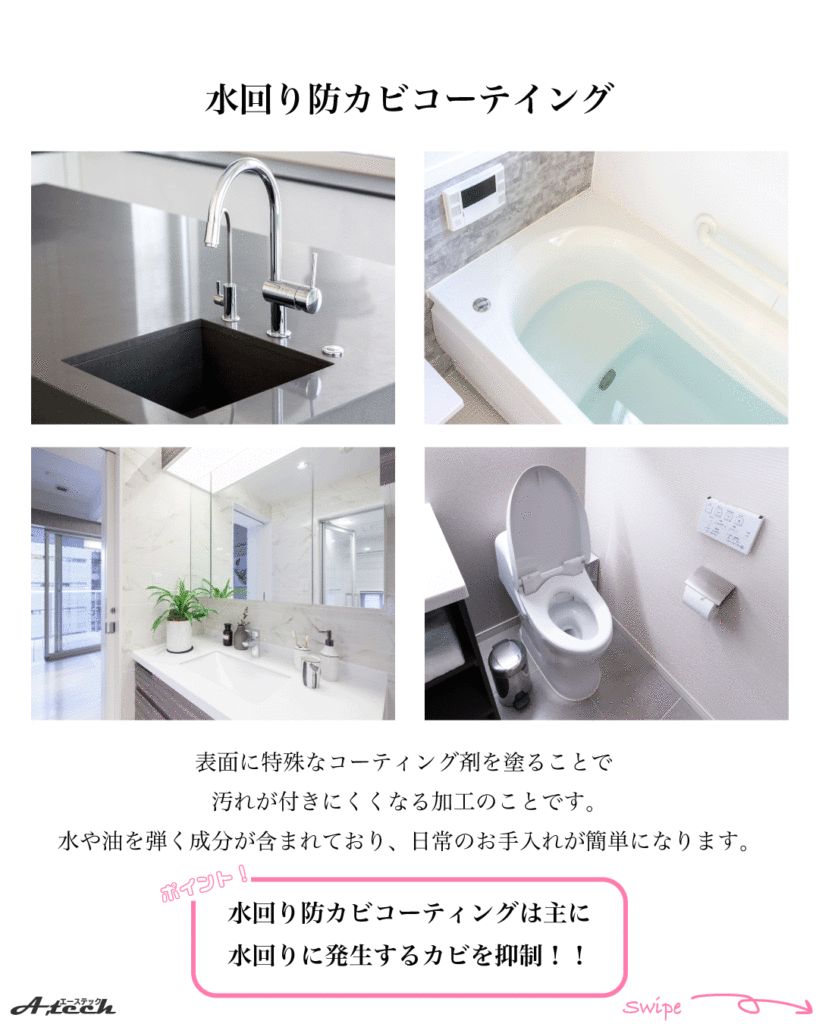 フロアコーティングは床をキズや汚れから守り、美しさを長く保つ基本の仕上げです。そして水回りコーティングは、キッチン・浴室・洗面・トイレなどの水を吸う場所に施工することで、カビや水アカ、汚れの付着を抑え、お掃除を格段にラクにしてくれます。