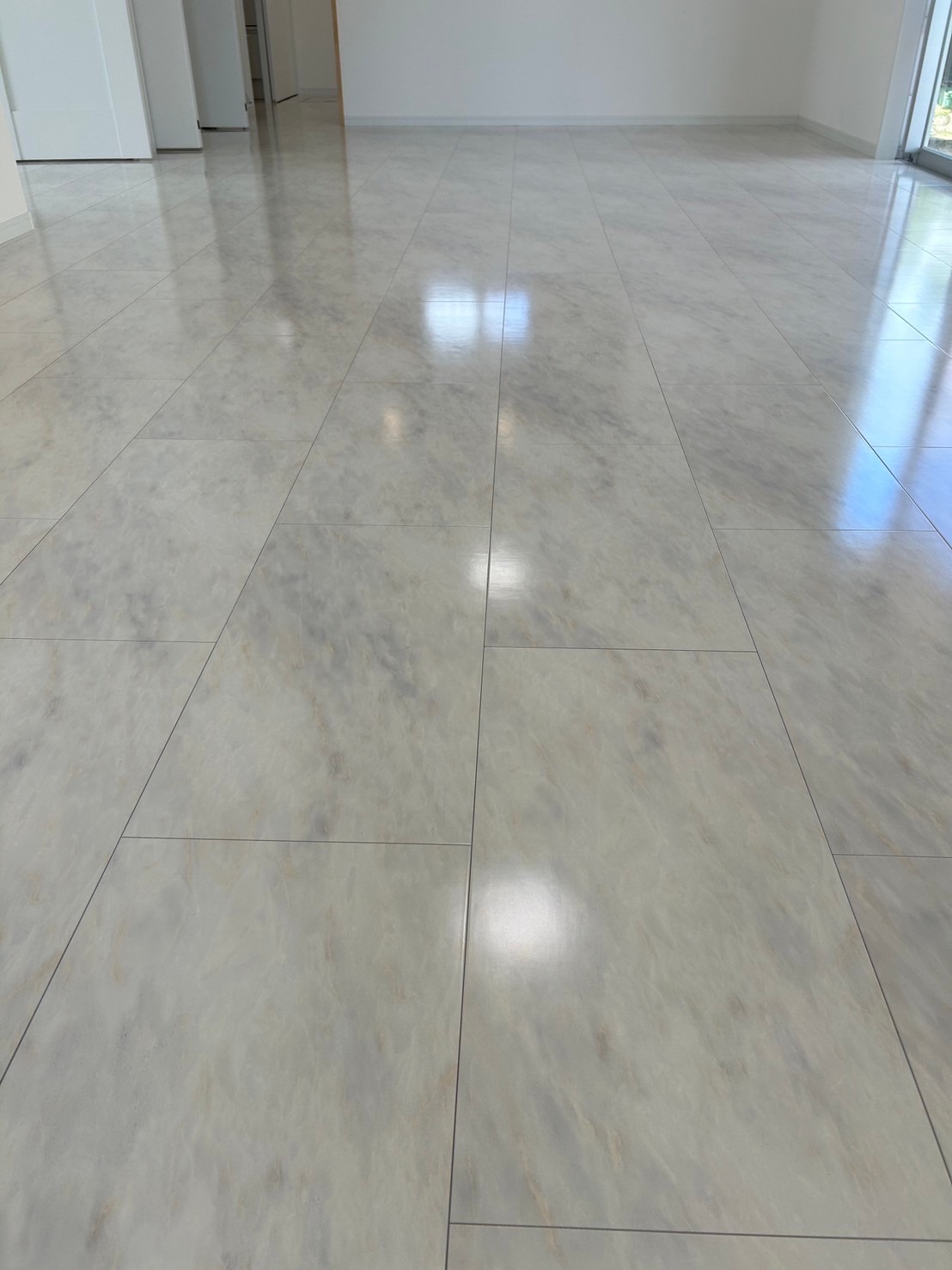 セラミックフロアコーティングを選択しました。微光沢タイプのコーティングにより、適度な反射効果が生まれ、室内の光を効率よく反射させることで空間全体が明るく広々と感じられます。また、ワックスがけなどの定期的なメンテナンスが不要になるため、美観と実用性を兼ね備えた理想的な選択です。